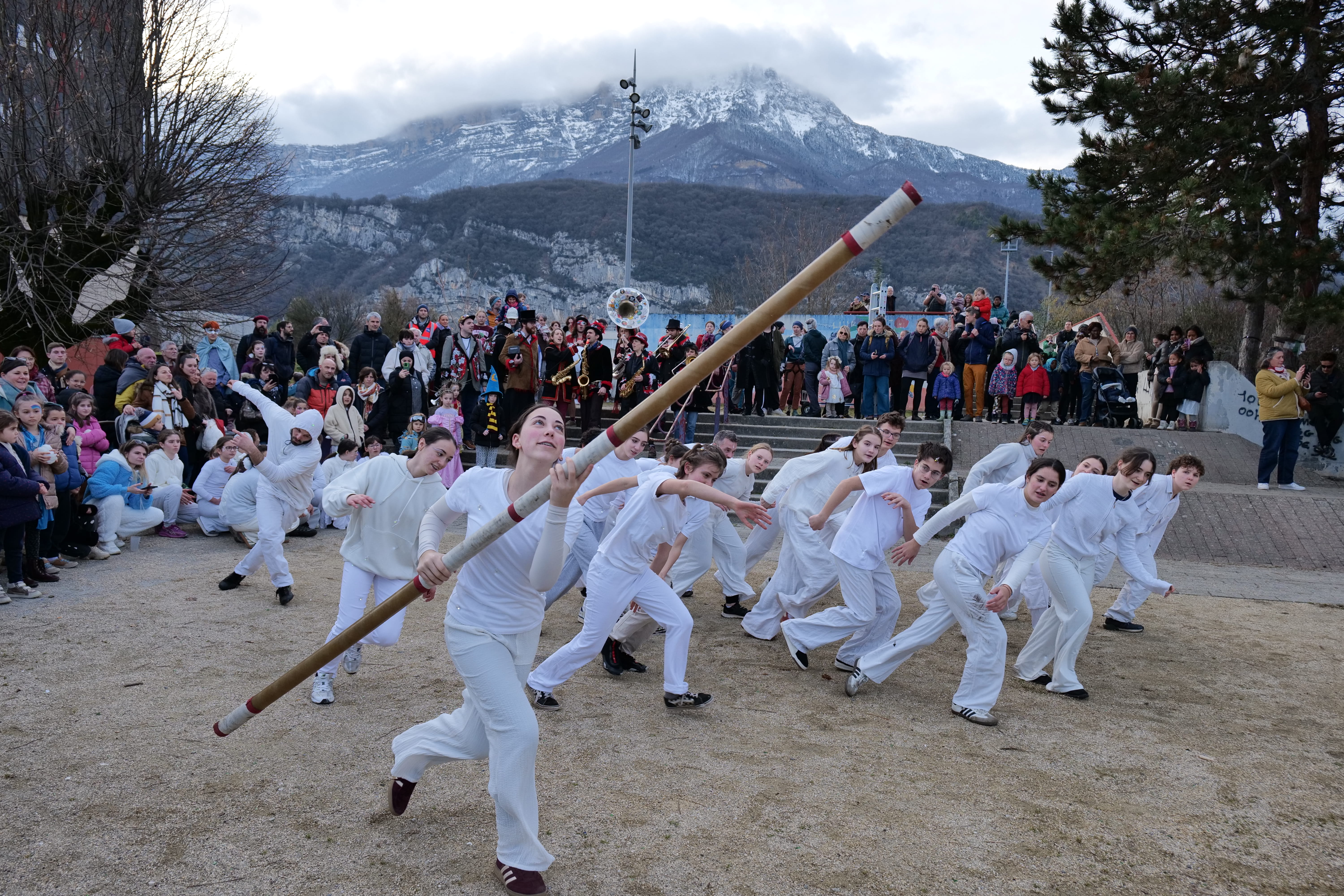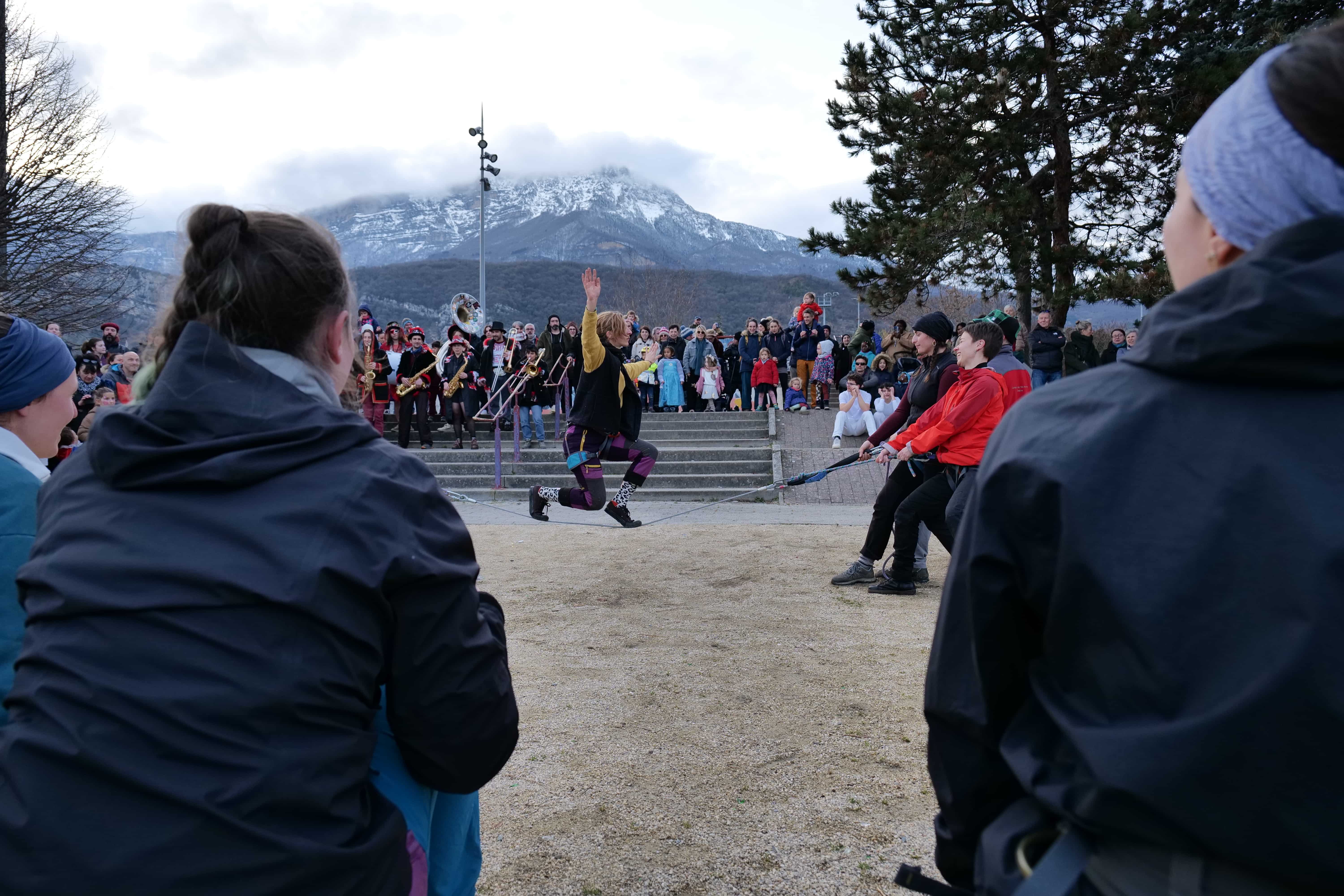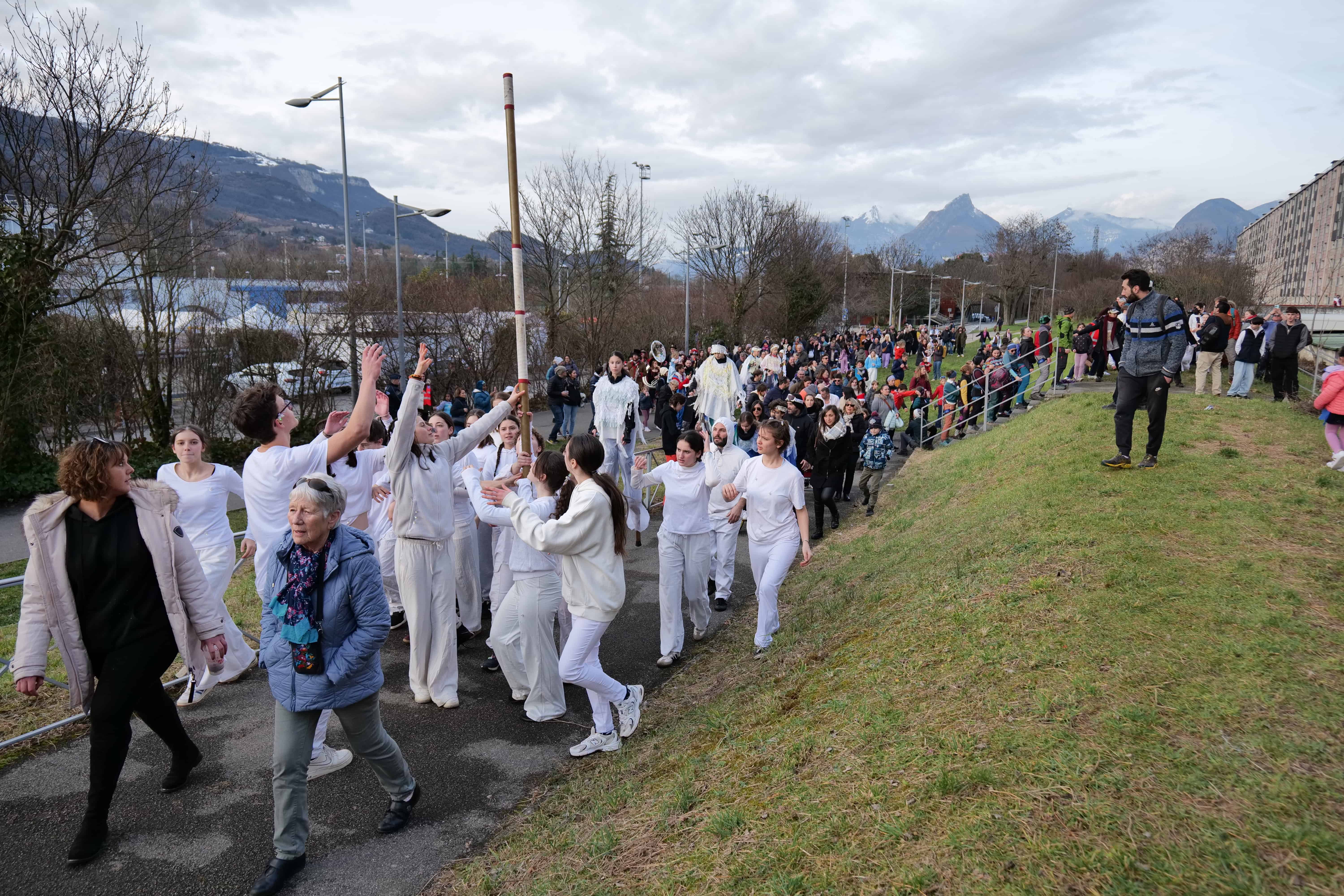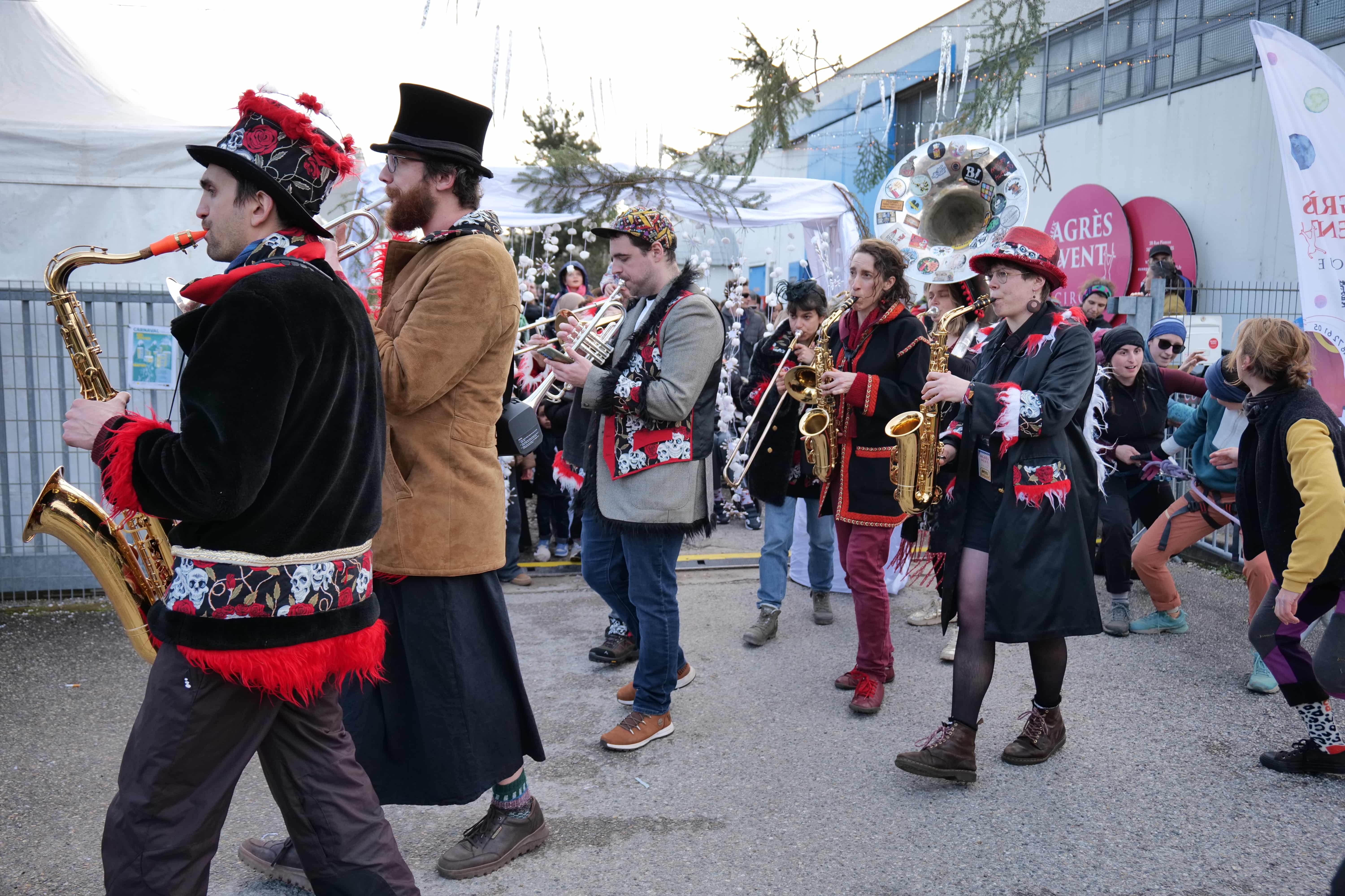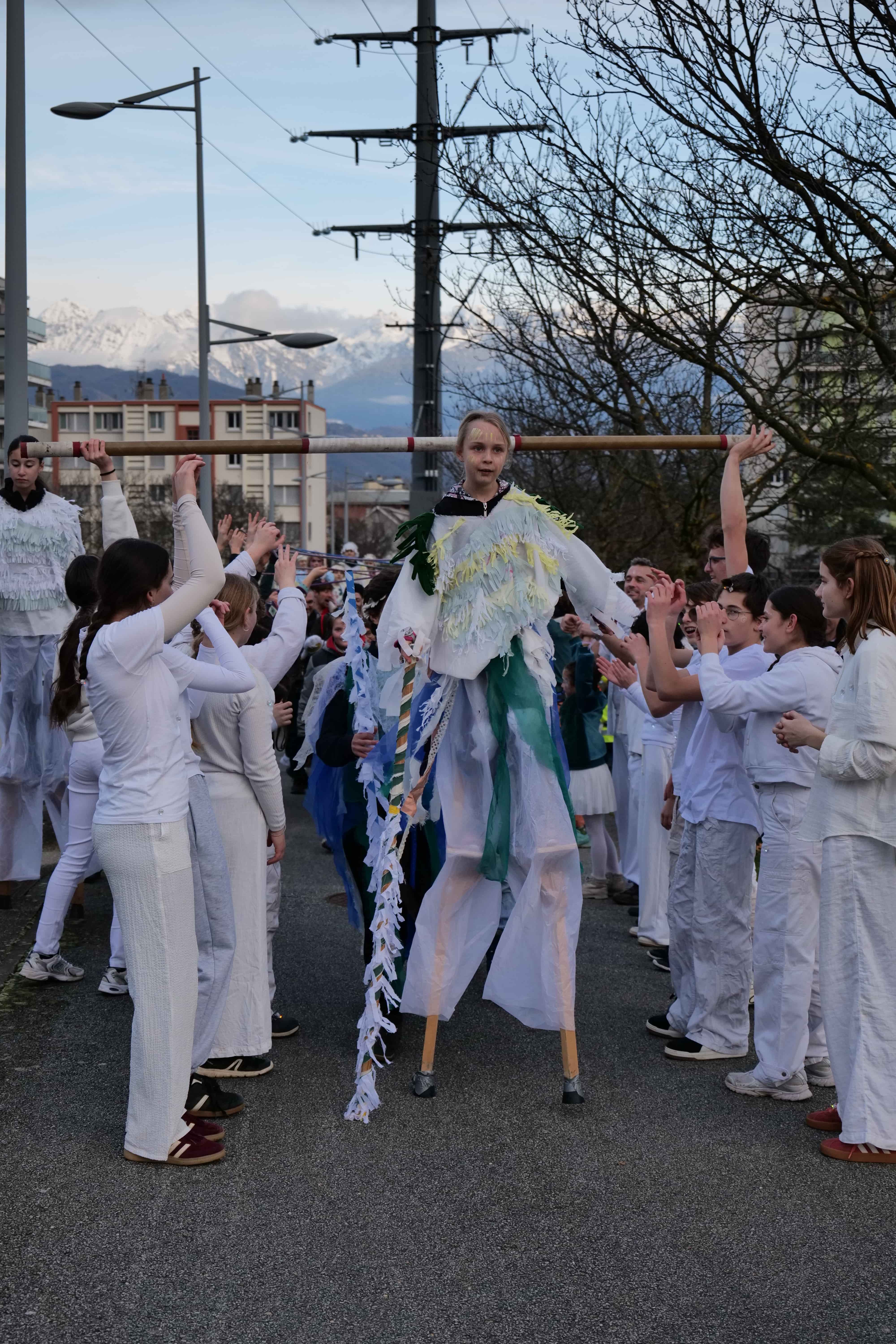 Tous les groupes d’âges de l’école de cirque, qui fête ses 20 ans cette année, se sont impliqués dans ce Carnaval’anche, des petits de six ans aux adultes ayant gardé leur âme d’enfant. Plus de 200 adhérent-es composent l’école de cirque, et certain-es enfourchaient monocycles, échasses, échelles, accompagnés par le public venu nombreux les soutenir et les suivre dans les rues. Côté musique, c’est la fanfare La mort subite qui accompagnait tout du long le défilé, pour des reprises de tubes planétaires et un brin de folie contagieuse. Un véritable « spectacle » organisé et préparé depuis les vacances de Noël par les circassien-nes, et qui faisait le bonheur du président Florent Le Parlouër et des nombreux bénévoles investis dans l’aventure. En fin d’après-midi, un spectacle pyrotechnique de la Compagnie Poly réchauffait le public, dans une atmosphère mystérieuse et enflammée. Et puisque 20 ans, ça se fête, « l’école essaiera d’organiser 20 événements tout au long de l’année sur Échirolles, avec un temps fort à La Rampe en avril », assurait Florent, lors du carnaval. Vivement le prochain !